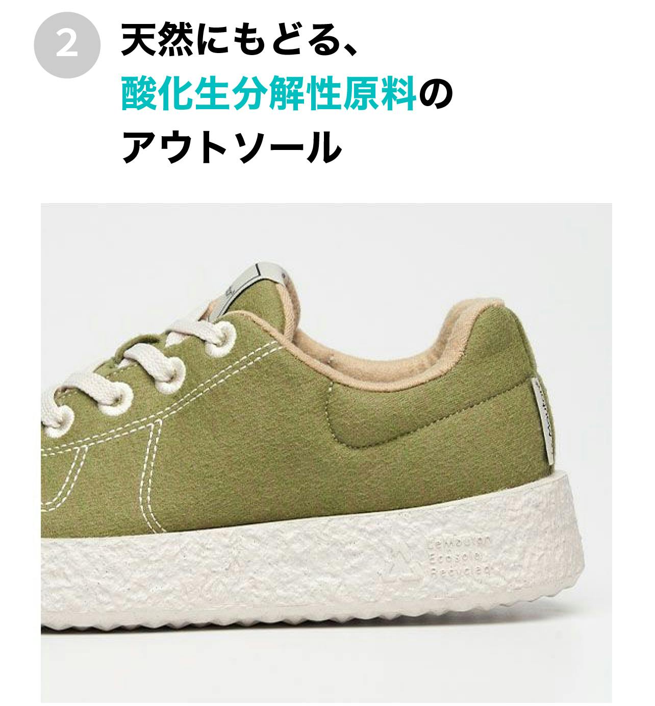 化学繊維で作られたアウトソールは廃棄した後、分解までに数十年から、長くて数百年もかかることもあります。自然を考える「ル・ムートン」はアウトソールにも価値を反映して、酸化生分解性原料を使用、廃棄された後でも再び自然に戻すことができるようにしています。