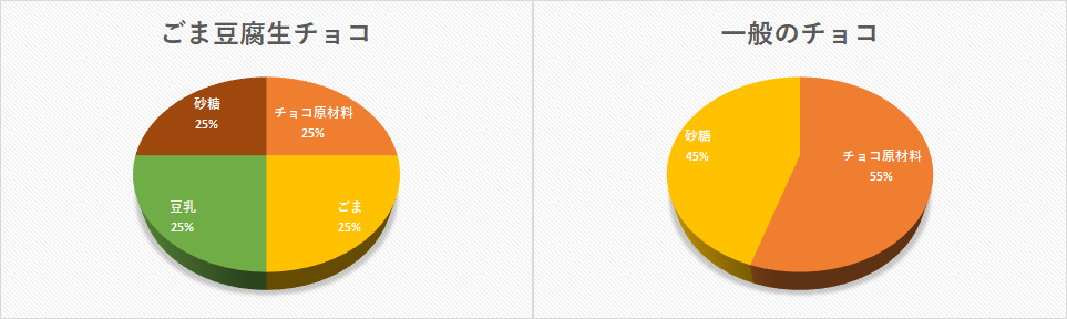 【ごま豆腐生チョコ】は、約1/2がごま豆腐でできていますので、一般のチョコよりも糖分が少なく、乳製品も不使用です。低カロリー&ヘルシーです。