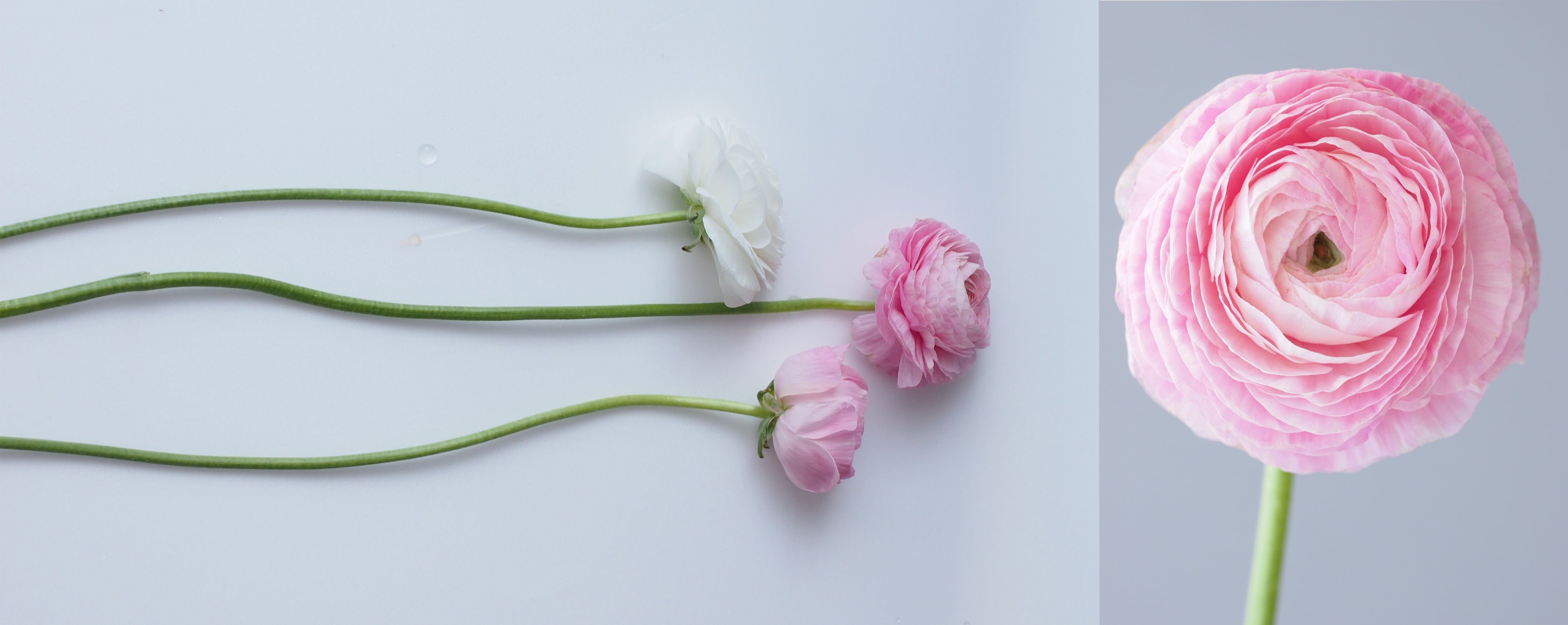 hananeに欠かせないのは「チャンスフラワー」の存在です。茎の長さや太さがまばらな規格外の花に、その名をつけました。通常ならば花市場に出回らず捨てられてしまう花たち。実際に、下のお写真のお花はラナンキュラスのチャンスフラワー。茎のうねりがお分かりになるでしょうか。ですが見ての通りお花自体はとても綺麗で、ご自宅で楽しむには問題ありません。むしろお客さまの中には、「飾る時に自分の方を向いてくれて可愛い」「個性があって選ぶのが楽しい」と話してくださる方も多くいらっしゃいます。