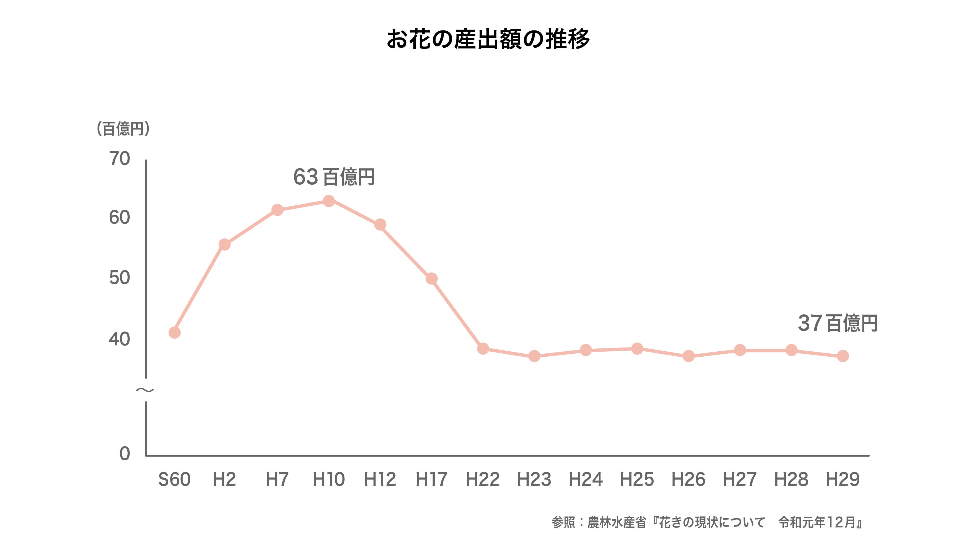 しかしながら近年、お花の消費が低迷しています。下記の図の通り、お花の産出額は平成10年をピークに平成23年から横ばいです。