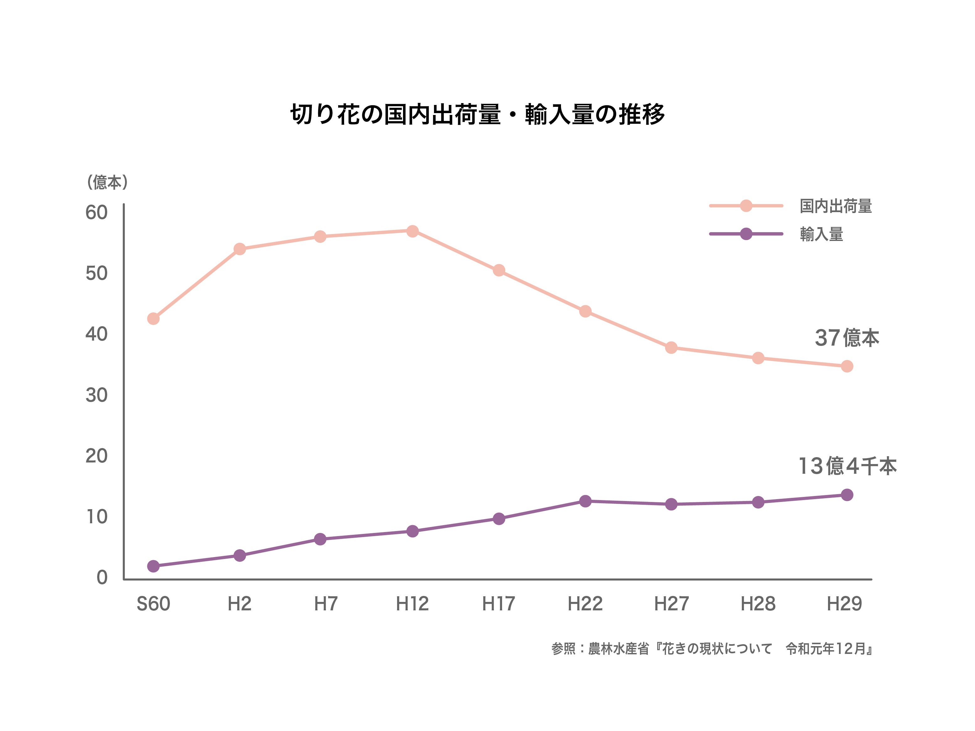 さらに、一般のご家庭やプレゼントにもよく使われる切り花においては、国産花の出荷量、つまり生産量が減少。そんな中で徐々に海外からの輸入のお花が伸びており、負のサイクルが続いている状況です。