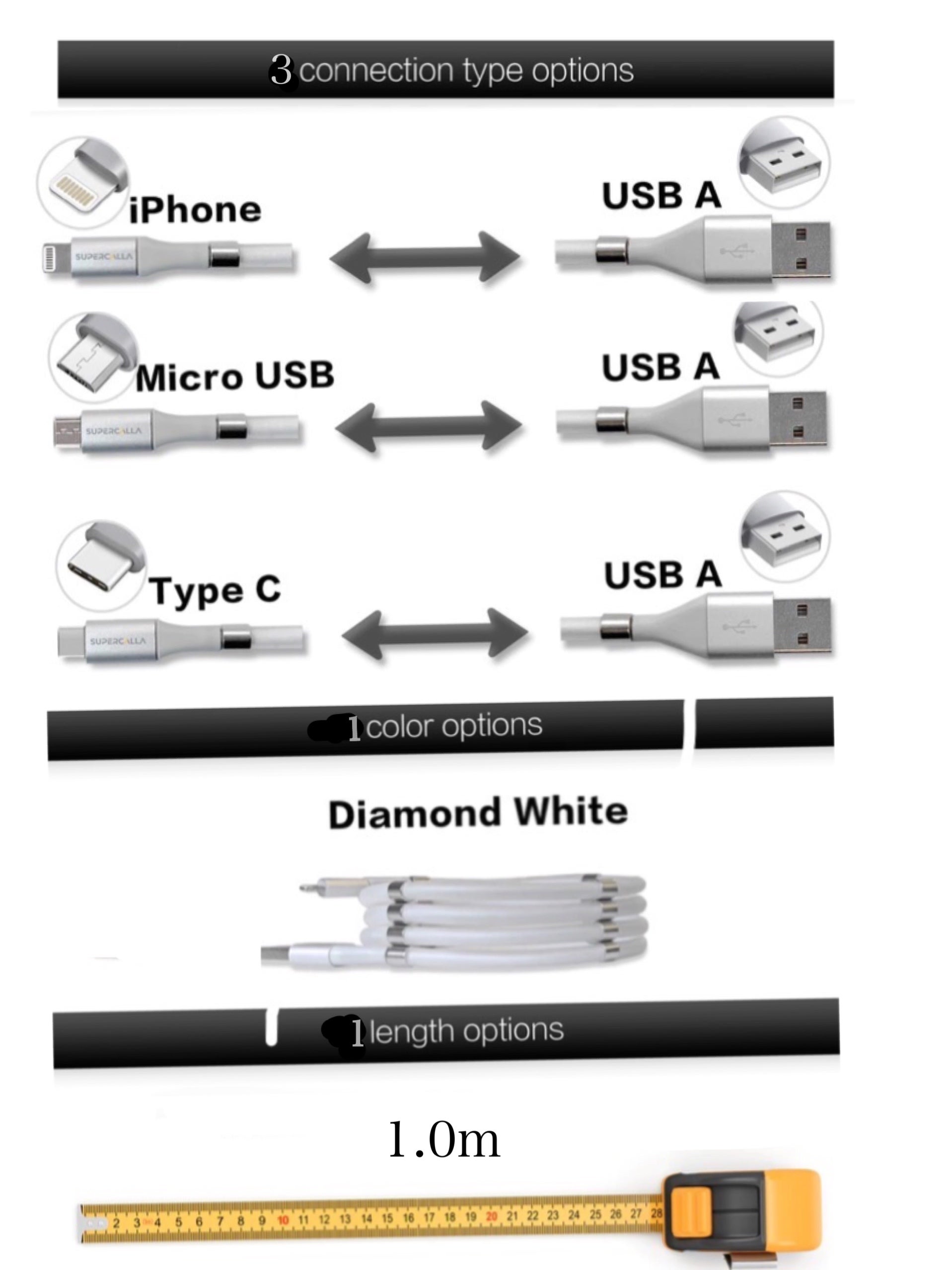 「SuperCalla」は、これ1本でUSB Type-AやType-Cなど3つのコネクトタイプに対応できる優れものです。