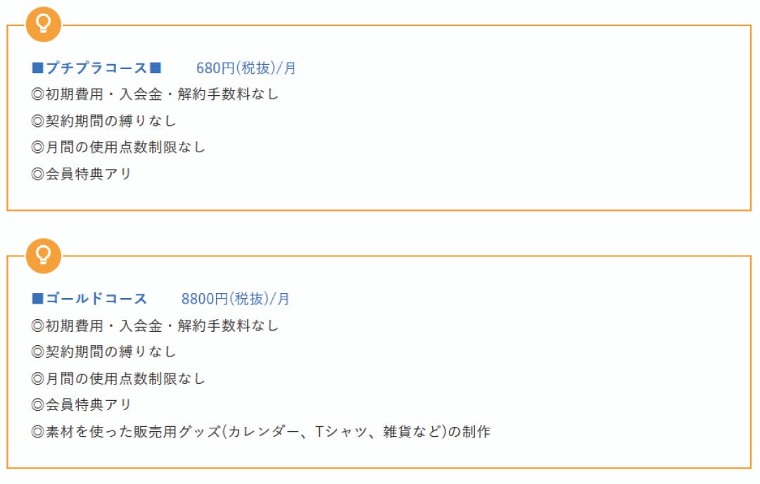 ゴールドコースでは、CLUB内にある素材を使った販売商品(カレンダー、Tシャツ、雑貨など)の販売も可能です。しかも販売利用についても月間使用点数に制限はありません。