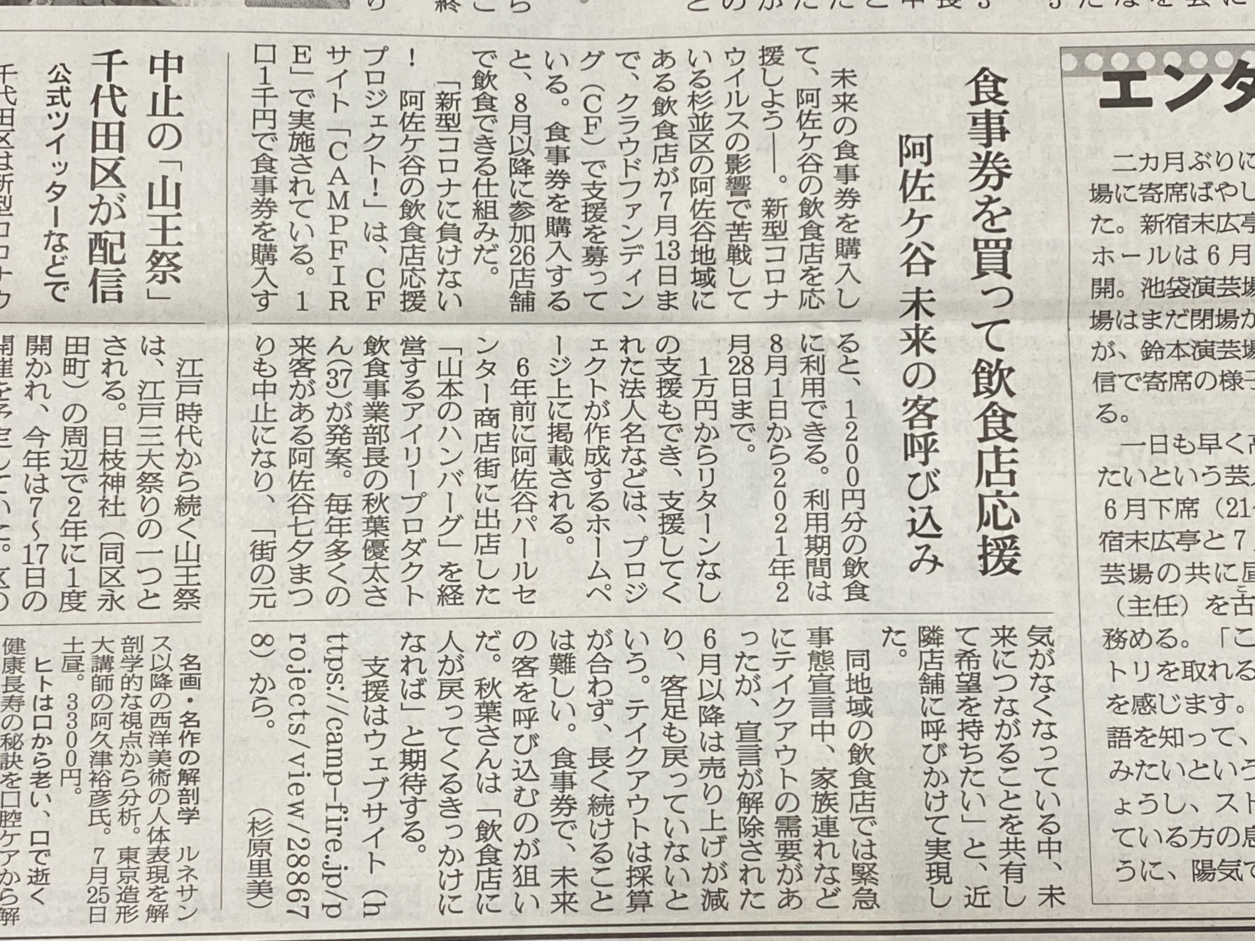 阿佐ヶ谷飲食店応援プロジェクト実行委員会の秋葉です。この度は、数多くの皆様のご支援、誠にありがとうございました。参加飲食店を代表して、改めて御礼申し上げます。チケット無し支援者様の掲載ページが出来上がりましたので、こちらで報告させて頂きます。合わせて、阿佐ヶ谷飲食店応援プロジェクトで、Tシャツのプレゼント込みの支援をして頂いた支援者様へもオリジナルTシャツを本日発送させて頂きました。末長く着用していただける様に、素材に拘ったオリジナルTシャツになりますので、到着を楽しみにしていてくださいませ。チケットリターンの支援者様は、8月1日より飲食店をご利用頂いている方もいるとは思いますが、これからも阿佐ヶ谷の飲食店を末長く、宜しくお願い申し上げます。https://www.asagaya-inshokutenouen-pj.com/