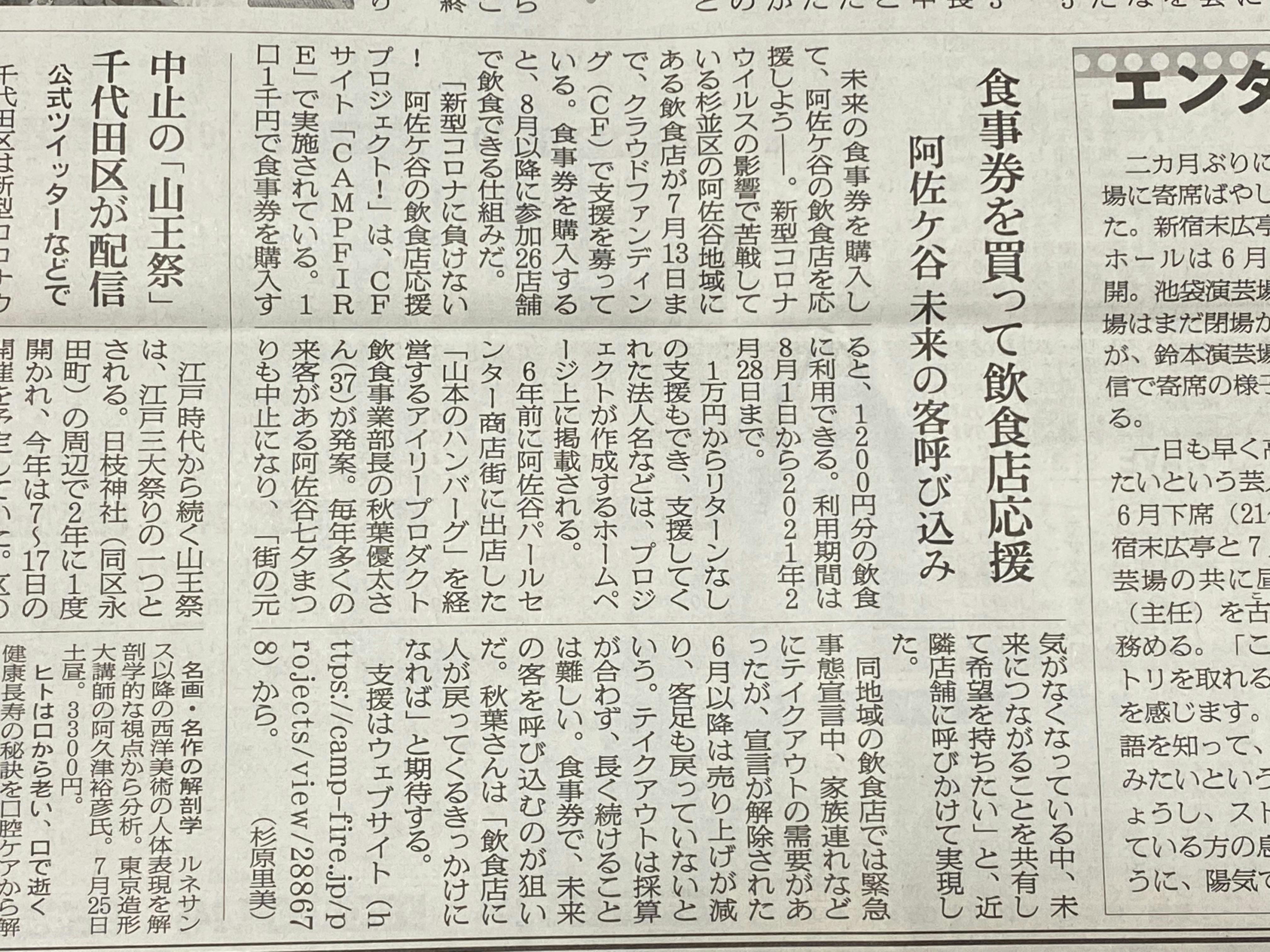 6月18日付の朝日新聞朝刊に本プロジェクト【新型コロナに負けない!阿佐ヶ谷の飲食店応援プロジェクト!】の記事を掲載頂きました!