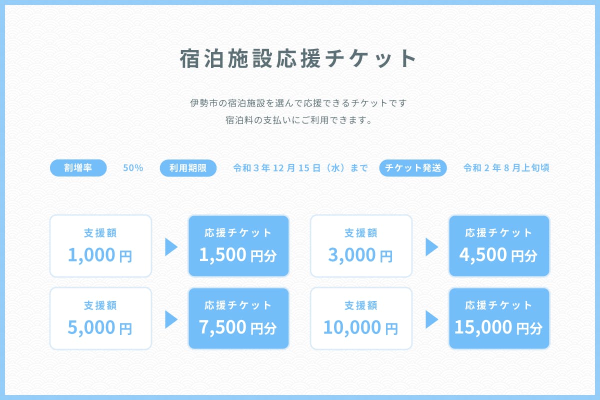 新型コロナウィルス感染症の拡大で、経済的な影響を受けた市内の飲食店・宿泊施設を応援するため、クラウドファンディングサービスを利用して支援を募り、支援者へは、返礼品としてプレミアム付き応援券「食・泊みらいチケット」をお送りします。地域経済の活性化を図ると同時に、全国へ伊勢市の魅力あるお店やお宿を紹介し、観光PRを行って観光振興につなげることを目的に実施します。