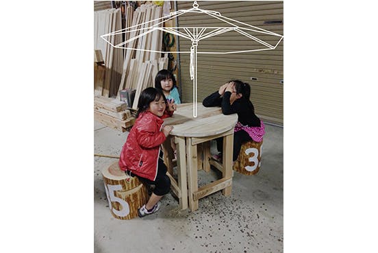 実は今、私たちも一生懸命手づくりしています。マルシェに訪れた皆さんがゆっくりとくつろげるようなベンチやテーブルを地元の間伐材を使って作っているところです。