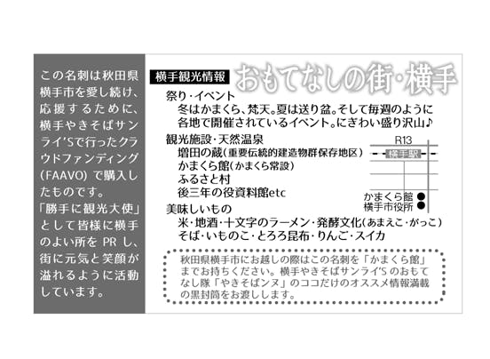 この名刺を持って横手市にあるかまくら館を訪ねてくださった方にはやきそばンヌの秘密のオススメ情報をプレゼント!同じ方の名刺が3枚揃えば。。。。グレードアップ名刺が注文できる権利が!アナタが名刺を配った方の中から、どれだけ横手市を訪れてくれるのか。。。アナタのトーク次第♪