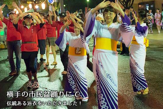 ▲横手の市民盆踊りに参加した際は、昔、婦人会のみなさんが着ていた「横手の盆おどり」と書かれた伝統ある浴衣を横手やきそばサンライ'Sにご寄付いただき、それを身につけて参加させて頂きました。見ている方から「その浴衣なつかしいね〜!」なんてお声がけいただきました(^^)