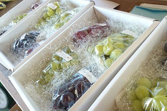 そのようにして収穫を迎えたブドウを送り出す時は、どこか娘を嫁に送り出す感覚に近いのかなと感じています。そんなブドウたちを送り出す際に着せている衣装(荷姿)がどこにでもあるありきたりな箱。それではブドウに対して失礼ではないかと、嫁入りならば花嫁衣装を着せて送り出すべきではないか。それも一目でどこのブドウかわかる衣装を。