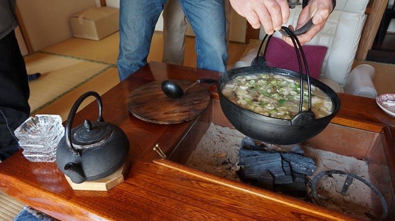 秋元さんのお宅では、立派な囲炉裏と南部鉄器でコトコト煮込んだ田舎汁をご馳走になりました。この日に合わせて飼っている鶏を解体していただき、そのお肉も入っていました。有り難くいただきました。