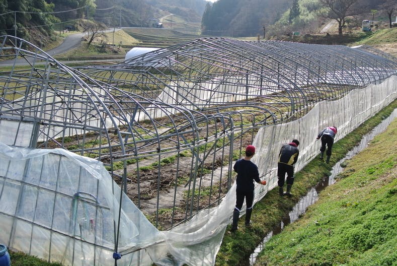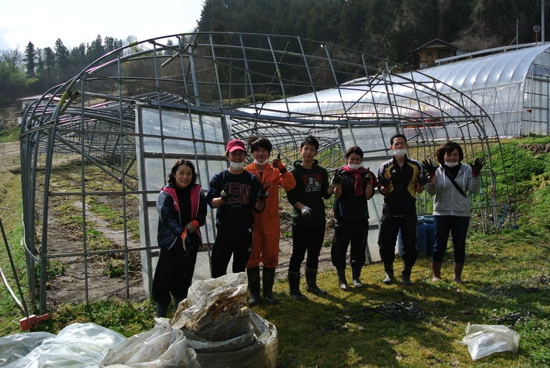 春の陽気の暖かな日に東京から来た明星大学村岡ゼミのみなさんと一緒にハウスのビニールはがしを行いました。