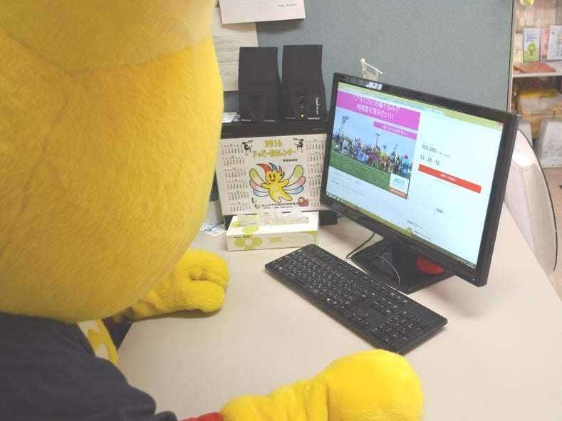 パソコンでクラウドファンディングに申し込むドッピー君