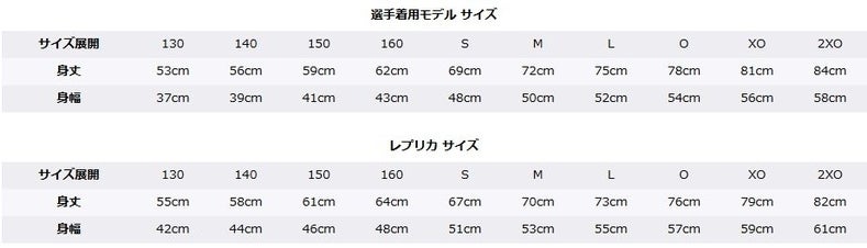 ユニフォーム同様、選手着用モデルとレプリカモデルの2種類選べます。サイズは下記のとおりです。