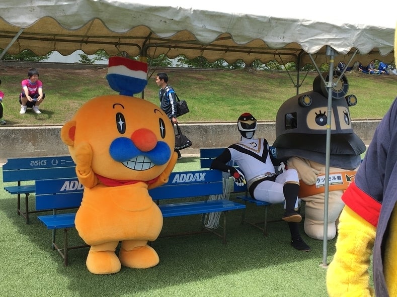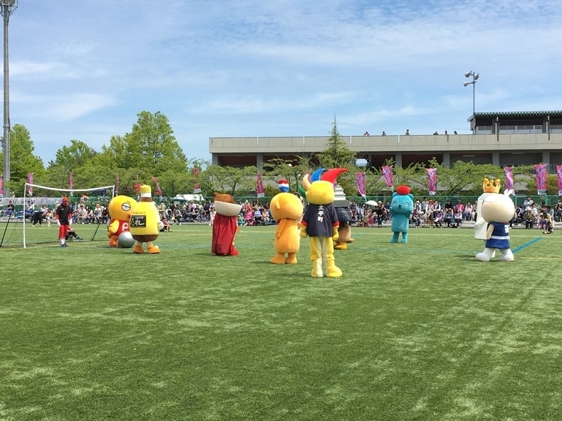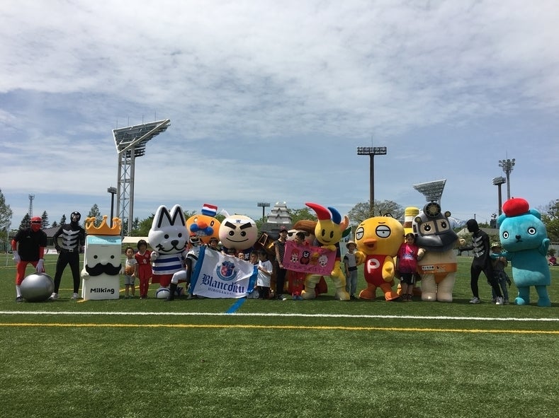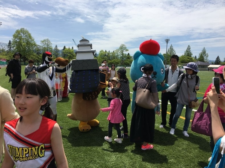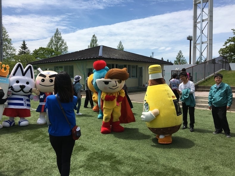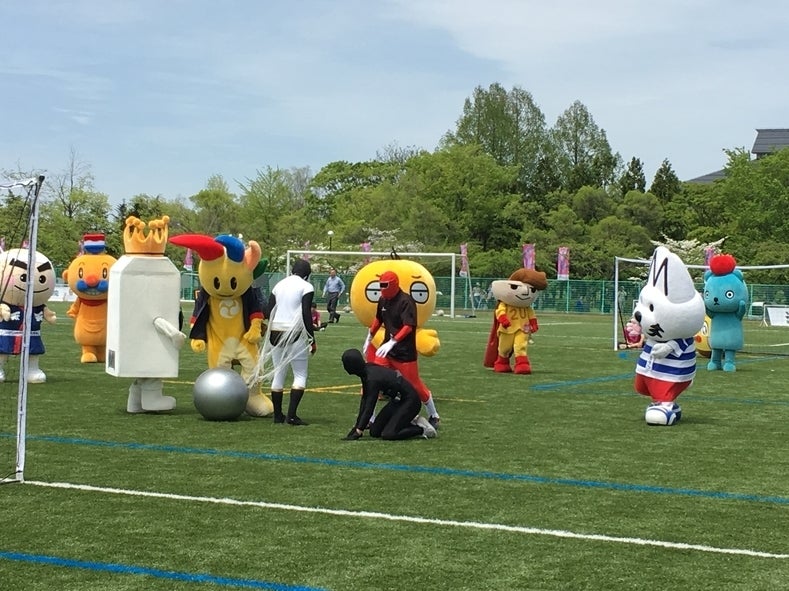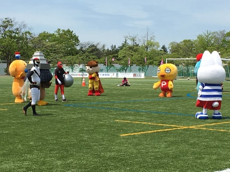 5月15日 ブランデュー弘前のホームゲームに先立って、津軽のゆるキャラ12体によるサッカーマッチが行われました。世紀の一戦!試合前からピリピリしたムードが漂っています。