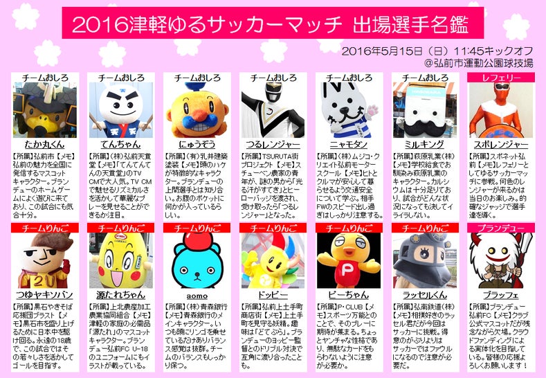 来る5月15日(日)のブランデュー弘前のホームゲームの前座でゆるキャラによるサッカーの試合が実施されます。