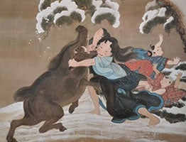 乳母という使命を担ったのゑと、雪が降って食べ物がなく生きるために 里に下りてきた大猪。猪に子がいたかも知れません。ここには善も悪もなく、命と命のまことに悲しい出会いがあるだけです。晶子はそのことに思いを致して、 「のゑも猪も、いまはお浄土で仏さまのお弟子になっているでしょうね」と詠っているのでしょう。