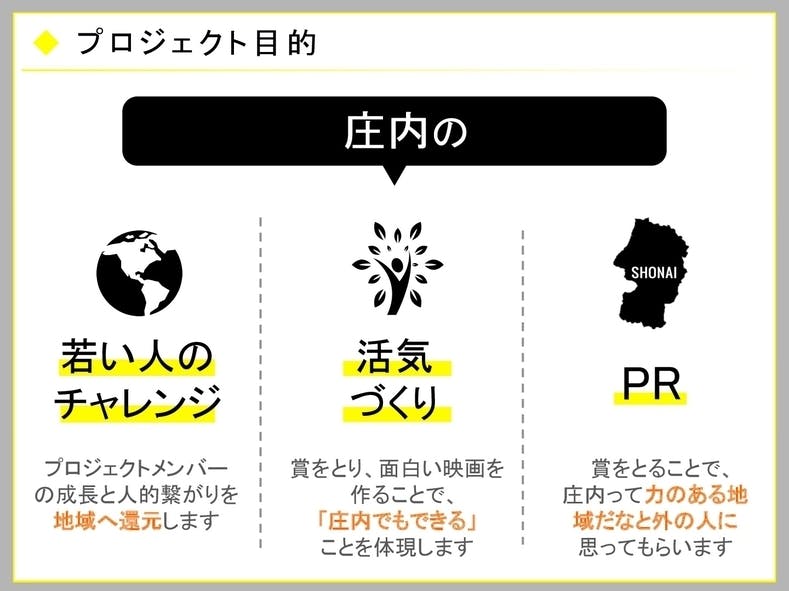 「みんなの力で一つのものを創りたい」という思いが映画制作というテーマに、「高みに挑戦したい」という思いがコンテスト入賞という目標になり、プロジェクトをスタートさせました。高みを目指し、映画祭で賞を取ることで「庄内って力がある地域だな」、「地方でもやればできるんだな」ということを体現化し、庄内を活気付けさせるための起爆剤になりうるのではないかと考えております。
