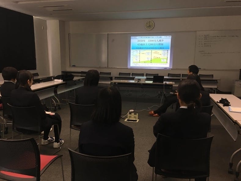 私たちは「探究活動」という、毎年2年生が様々なグループに別れ、半年をかけて一つの課題に挑戦する授業の中で、どうしたら地域が活性化するのか、秋田の問題点は何かについて考えました。