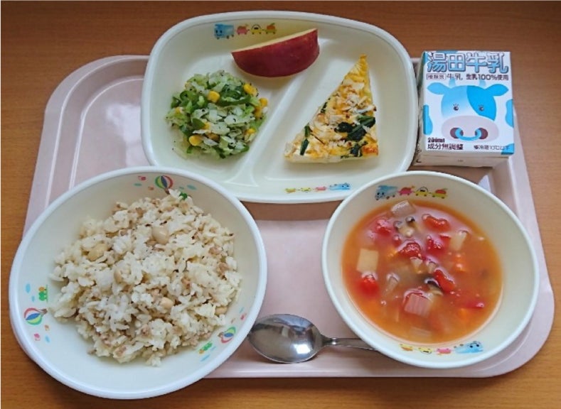 地場産物の牛肉と大豆に食物繊維が豊富な雑穀を入れて炊いたピラフ。大豆や雑穀を入れることで、栄養価だけでなく、噛み応えがアップする。