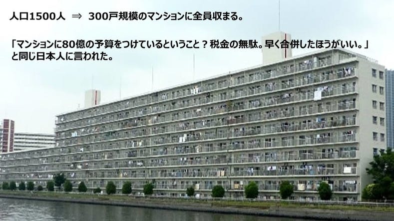 ある人に言われました。そんな小さな村に国庫支出金や地方交付税交付金などの多額の予算をつけている意味 があるのか?もし、村の人たちをすべてマンションに詰め込んだらすべての問題は解決するといわれました。