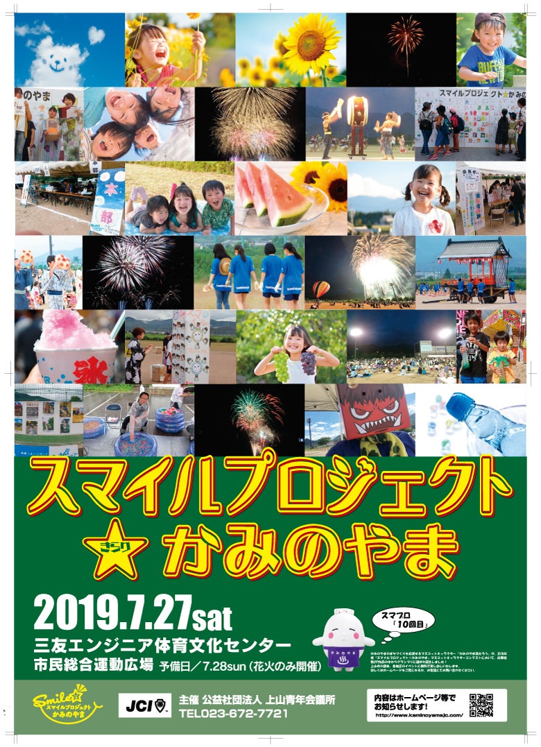 内容 :スマイル市民花火、かみのやまるしぇ、ステージイベント(工藤あやのコンサート等)、ブース・露 店出店、プロジェクター投影、「スマイルプロジェクト☆かみのやま」の歴史掲示、スマイル絵画コンクールetc.