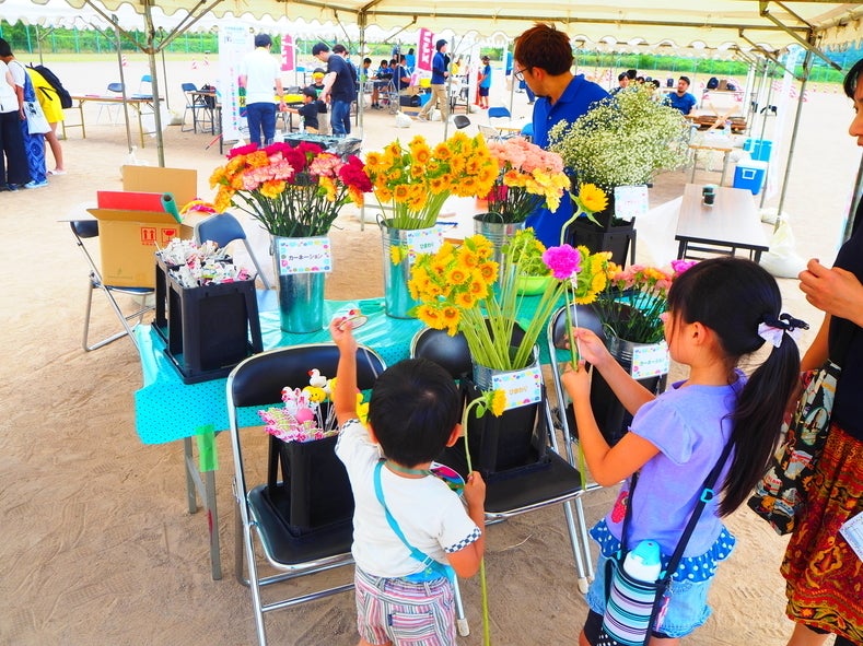 上山市で働く企業様にご協力いただき会場内にて子どもたちにお仕事体験をしていただいています。2018年はフラワーアレンジメントやネイルアート体験、歯医者体験にお面作り体験といった普段体験することが出来ない体験を出来る事業を用意しました。