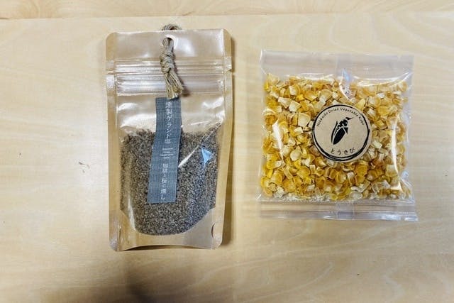 今回は、季節のドライベジ一点と、こちらも手作りで素材にもこだわった大人気商品、燻製塩と燻製胡椒を今回のリターン用に特別にブレンドした、燻製塩胡椒がBOXに入ります!