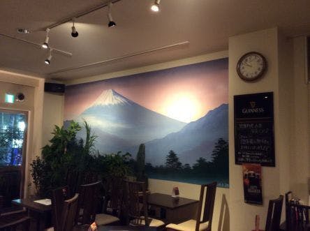 カフェに暖簾を借りる?と聞いて疑問に思われるかもしれませんが、高円寺にある小杉湯さんが好きで高円寺にお店をオープンさせたという銭湯好きな「Grain」のご主人。店内の壁にも銭湯絵師の丸山さんが描かれた富士山の絵があり、食事をしながら銭湯気分が楽しめる、銭湯好きには嬉しいお店となっております(^^)ご主人に聞いたところ、開店の際にお店でライブペインティングをしたとのこと。(ライブペインティングの先輩です!)