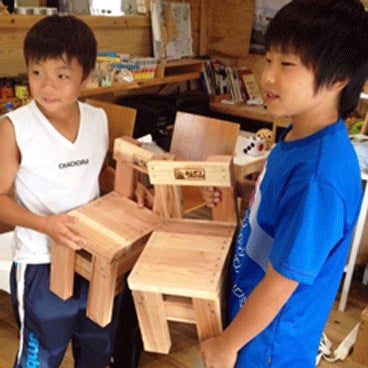 ▲自分で作った椅子を持つ子供達
