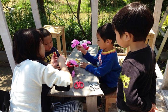 ワークショップでは上の写真のようなフラワーアレンジメントから、椅子や机など、家庭ではなかなか体験するできないモノ作り体験をご用意しています。トンカチや本物の木材を用いて作業は大変ですが、その分、完成したときには大きな達成感を感じて頂けるのではないかと考えています。