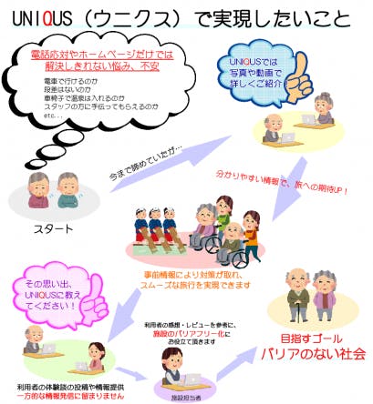 皆さま、こんにちは! 今日は、なぜ「UNIQUS(ウニクス)」のようなバリアフリー情報サイトが必要なのか? について書いてみたいと思います。 まずご紹介したいのはこちら。 観光庁の資料です。 ユニバーサルツーリズムにおけるサービス提供に関する調査 ここから引用します。 引用ここから>>> 人口減少や経済低迷による給与水準の低下、若者の旅行離れ(ゼロ回層の出現)などにより、 旅行における需要は低迷を続けており、旅行需要の喚起は旅行業界だけでなく、日本経済を活 性化させる上でも重要な課題である。 また、インターネットの出現などにより、旅行の形態や予約の方法なども大きく変わってきている。 近年のデータをみると、旅行の予約方法は51%がインターネットとなっており(出典:数字が語る旅行業 2011/一般社団法人日本旅行業協会(JATA))、旅行事業者の窓口を通しての旅行予約は激減しているも のと想定される。 ⇒旅行需要の喚起のため、また日本経済の活性化のためにも、 潜在的需要が大きい高齢者 障がい者の旅行 の対応は必要不可欠 <<<引用ここまで 資料によると、2000年から2010年で旅行総消費額(国内宿泊旅行)は20%減です。 今は2014年、さらに下がっていると考えていいと思います。 国も、観光地に高齢者・身体障がい者の集客が必須であると考えています。 しかし、それに対して消極的な施設は、 「ノウハウがない」、「事故のリスクがある」などと考えており、 具体的な取り組みまで進まないのが現状のようです。 私たち「UNIQUS(ウニクス)」では、 高齢者・身体障がい者が実際に旅行をすることになれば、 お手伝いできる介護ヘルパーや福祉車輌が必要にあり、 また、実際のバリアフリー化にあたっては、 法律はもちろんのこと、UNIQUSユーザの声も参考になると考えております。 そういった付加価値、付帯情報も発信し、 社会貢献へ繋げたいという思いです。 引き続き、皆さまのご支援を必要としています。 何卒宜しくお願いいたします!