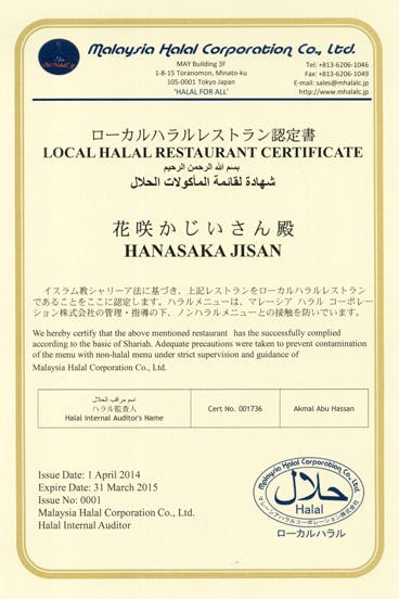 「花咲じいさん」では、東京で唯一、2011年秋ぐちから和食のハラル料理を提供させて頂いております。2013年12月には日本で初めてのローカルハラルレストラン認証を公式に取得することもでき、今では月100名ほどのイスラム圏のお客様にハラル和食をお出しさせて頂いております。