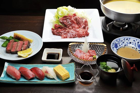 鮨(本鮪大トロ、赤身、中トロ、鯛、玉子)