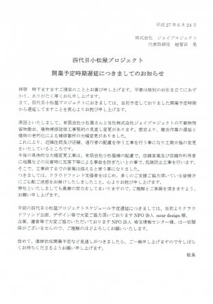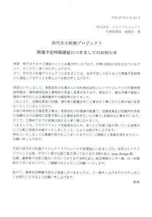 プロジェクトのお店オーナーである有限会社小松屋様と契約関係を結んでいる株式会社ジョイプロジェクト様より、今回の件に関してのお知らせです。