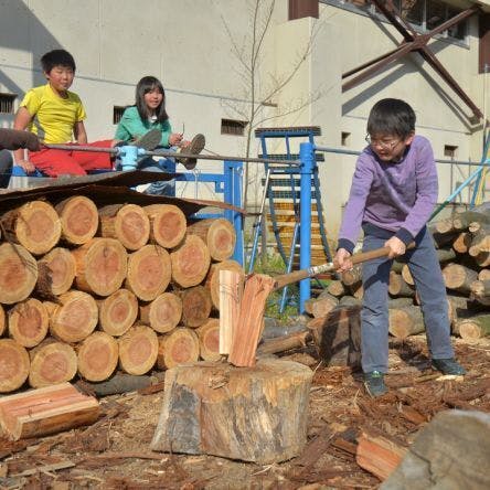 会場の小宮ふるさと自然体験学校のスタッフはマキ割り体験ができるワークショップを開催してくれます