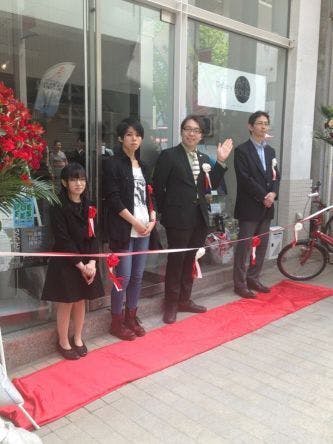 左から新店舗のスタッフに就任した絵描きの智乃さん、企画展示室で5月6日まで個展開催中の写真作家望月柚花さん。アートスープ代表の私と中央通り商店街の理事長大橋さん。