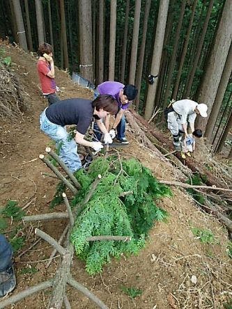 2015年6月14日(雨のち曇)。朝まで降ってた雨も、みんなが集合する時間にはやんで、日差しも強くない中総勢12名で中島さんの山に入って、枝を集めてきましたヨ。