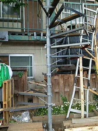 そして一段一段上から支えを入れて、ボルト締めて、階段入れて締めてを繰り返していきます。