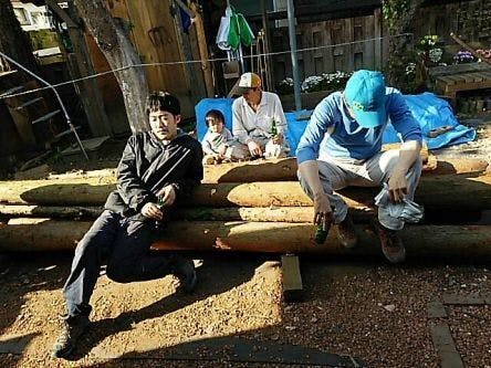 ここでさらに山の助っ人が来て丸太の引っ張り方、置き方、とめ方を教えてもらいながら慎重な作業が続きました。