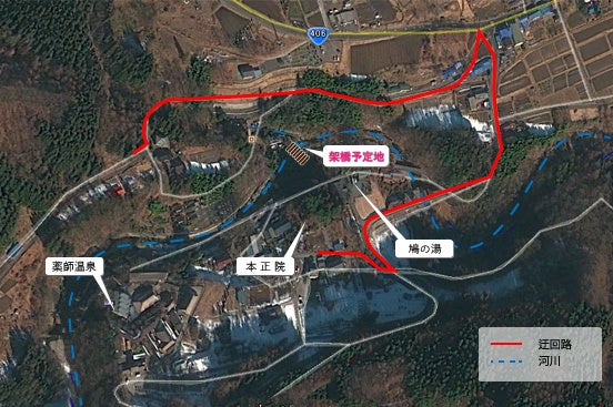 しかし住民の高齢化が進んだいま、橋の再設置は思うようにいかず、高齢の住民達は坂道を登り降りしながらう回路を大きく遠回りしている状況です。(温泉郷配置図の「本正院」から「温川温泉露天風呂」へ続く印をつけた部分が、この迂回路にあたります)
