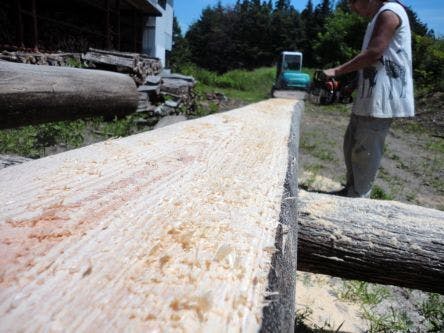 地内で先行して伐採をし乾燥しておいた丸太(現地伐採の杉)の加工作業をしていただきました。