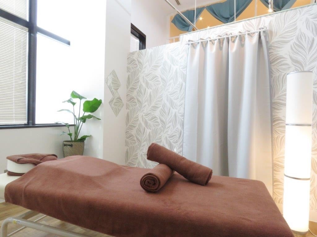 施術室は全部で3室、入口は扉ではなく通気を意識して可動式カーテンになっております