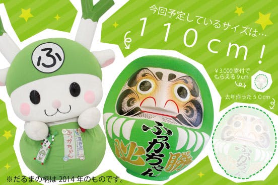 ご支援者のかた(3,000円以上)には、ふっかちゃんミニだるま(9センチ)をお贈りしますので、出陣式の時に一緒にだるまの目入れをしましょう!