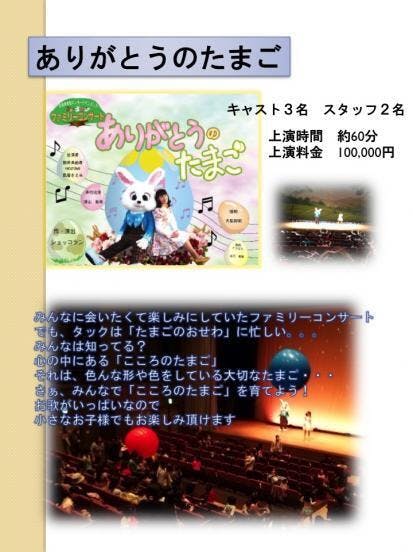 みんなのこころのたまごと一緒に素敵な言葉も探します。素敵が沢山集まると・・・6ケ月の赤ちゃんから楽しむことが出来るお歌とダンスが沢山のファミリーコンサート作品。