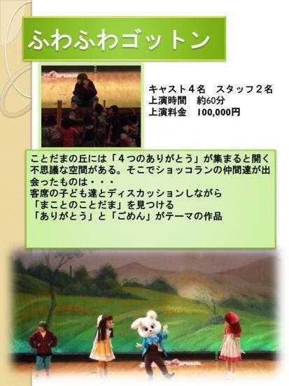 また、人形劇に登場するキャラクター達も世界中の「ありがとう」の意味をもちます。例えばメインキャラクターのうさぎのぬいぐるみ「タック」はノルウェー地方の言葉、きまぐれ猫の「ダンニャワード」はヒンズー語、着せ替え人形の「メルシー」はフランス語・・・ショッコランの仲間達は「ありがとう」で出来ているのです。そんな仲間達と一緒に「ありがとう」を探すステージショーの公演を行っております。