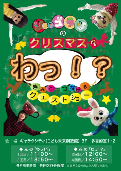 【ショッコランのクリスマス~わ!?~】ショッコランのクリスマスは26日にやって来る。クリスマスの日に忙しかったサンタさんの為のクリスマス会。なのに、悪い魔法で仲間達の声が何者かに奪われる!参加型エンターテイメントだからこそ出来る、みんなで考えるクエストショー。