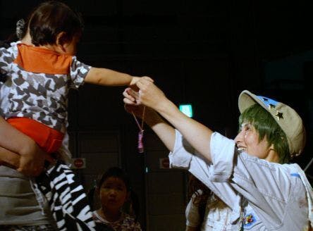 一人ひとりのお客様にカズ―(楽器)を配り、みんなで演奏したり、、、