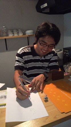 今日は、何人かの方に実際に私たちが作ったボールペンを使ってもらいました。 写真は、Design Lab. tsdc の佐藤さんです。 最初にペンを持って頂いた時の感想は、「軽いんですね!」でした。 少し見え難いかもしれませんが、 スラスラと書いて頂いたので、 写真の中でボールペンがブレて写っています。 見た目のシンプルさや作りの良さにもお褒めの言葉を頂きました。 色々な人に応援をしてもらい、毎回、毎回、嬉しい気持ちになります。 そして、「頑張らなくては!」っと気持ちを引き締めています!