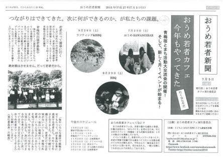 今回は、普段おうめ若者カフェがどんな活動をしているかを紹介します。 定期的に発行している「おうめ若者新聞」です! 今年は新しく「月1イベント」の開催に取り組んでいます。 昨年までは「つどい」と称し、イベントに向けてのミーティングを行っていました。しかし「ミーティングってなんかお堅いイメージだよね・・・」のような声があがり、もっと若者が参加しやすい、集まりやすいシステムに変更しました! 青梅の自然を満喫できるラフティングや、青梅の地酒「澤乃井」をつくる小澤酒造さんの見学ツアーなどなど。 若者が参加したくなるようなイベントを月に1回開催し若者を集め、青梅で活動する様々な方とコラボをすることにより、地域での繋がりができるよう活動しています!